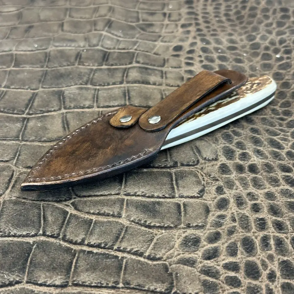 Une pochette pour une petit couteau forgé par Jacquy Martin, conçu pour être portée à la ceinture. Cuir tannage végétal